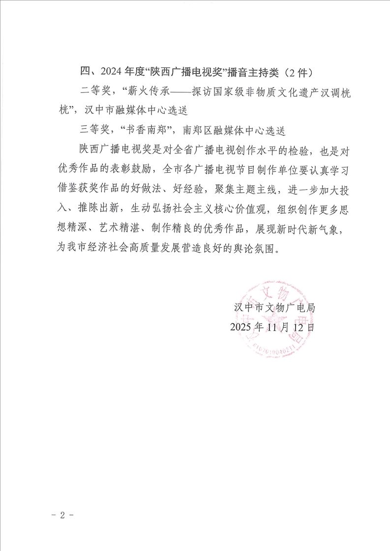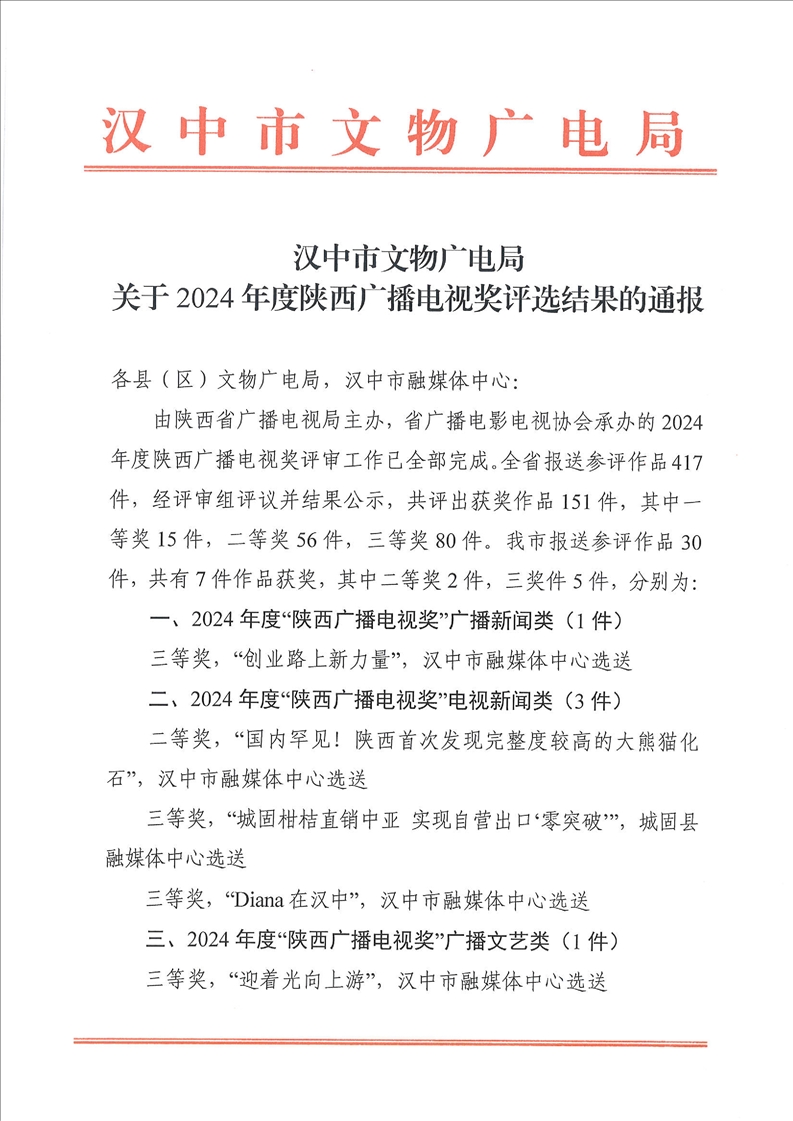 汉中市文物广电局关于2024年度陕西广播电视奖评选结果的通报