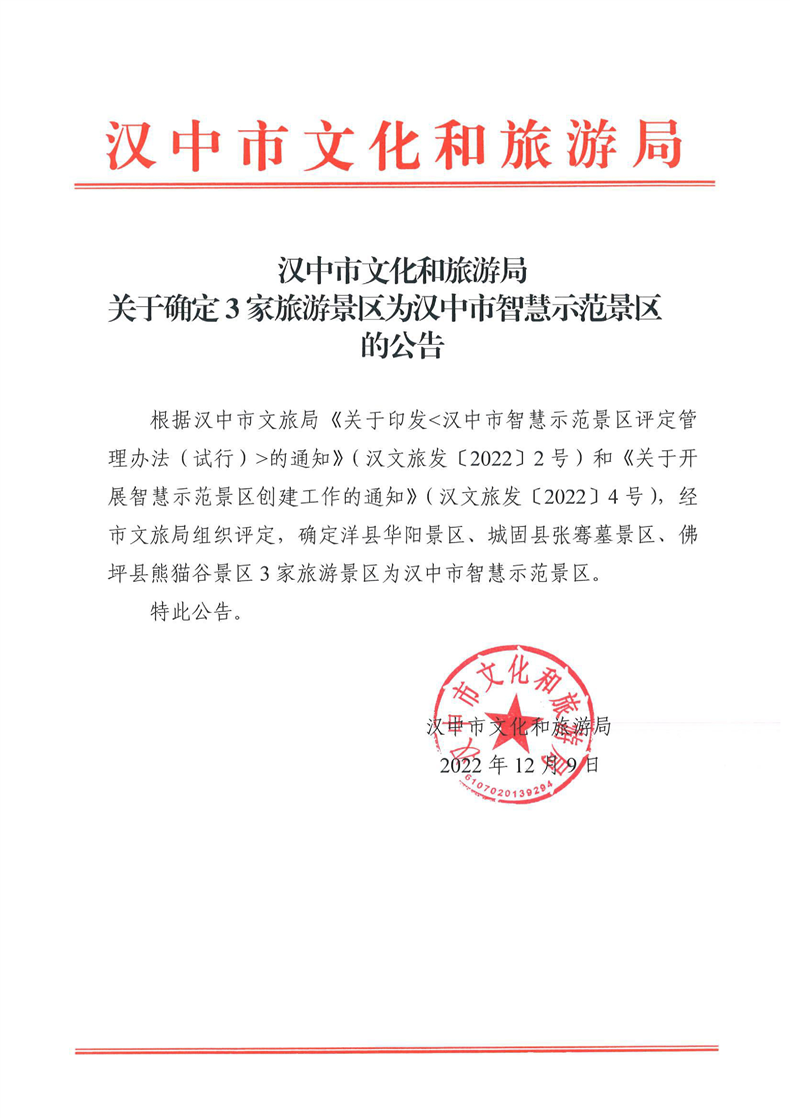 关于确定3家旅游景区为汉中市智慧示范景区的公告