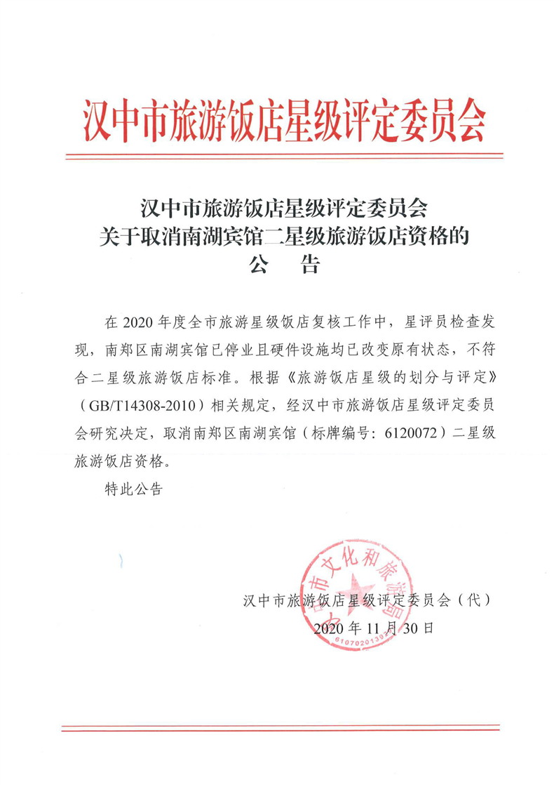 关于取消南湖宾馆二星级旅游饭店资格的公告