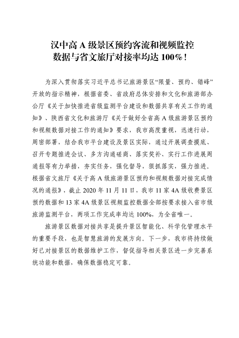 汉中高A级景区数据对接完成率位居全省前列