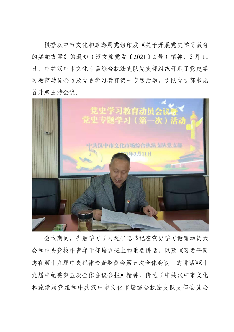 汉中市文化市场综合执法支队党支部扎实开展党史学习教育动员会暨党史学习教育第一专题活动